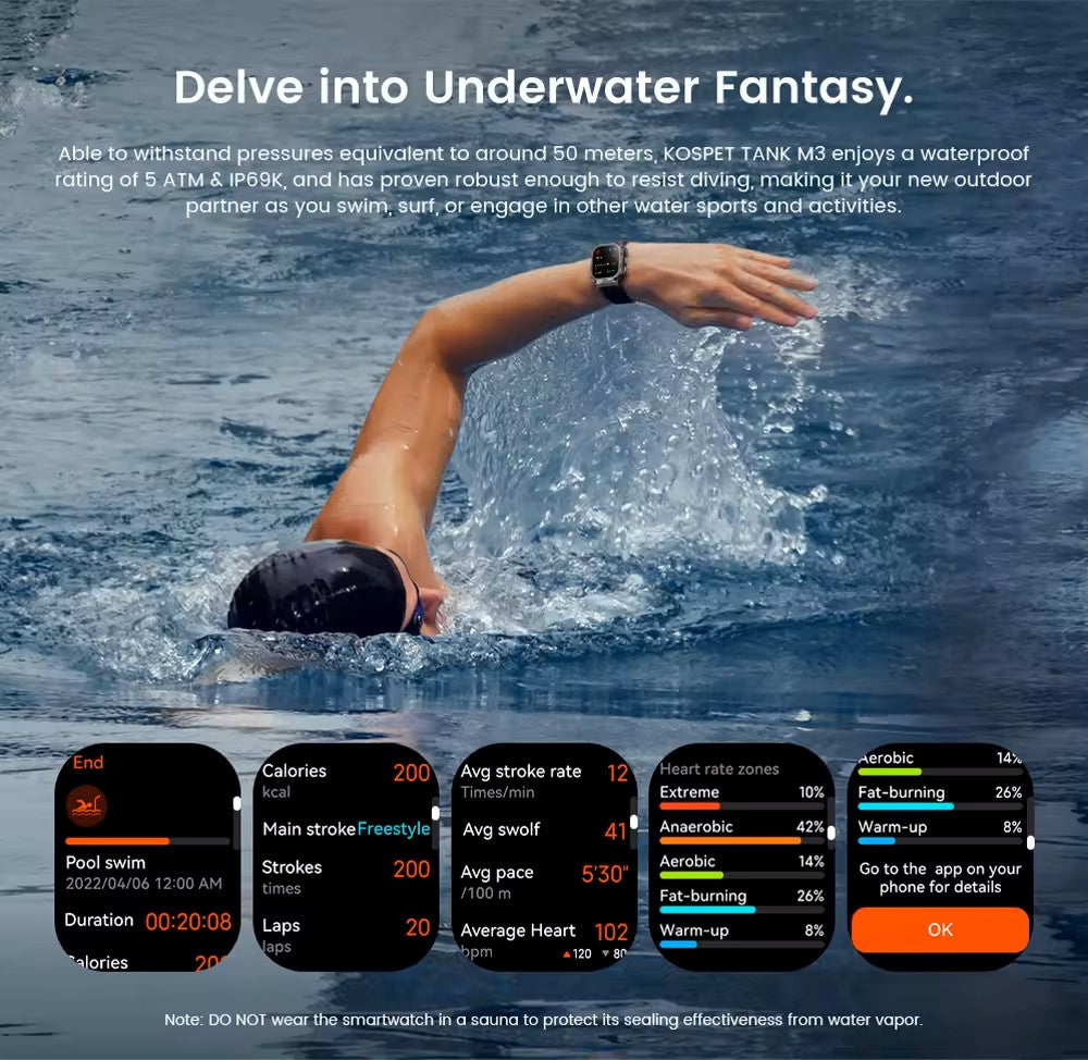 - Waterproof Ratings: 5ATM & IP69K (Supports swimming and diving)