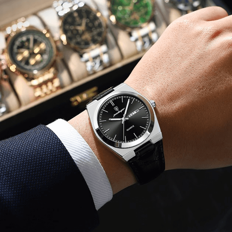 Poedagar 930 Elegant Ultra-Thin Gemstone Leather Luminous Quartz Watch- Black