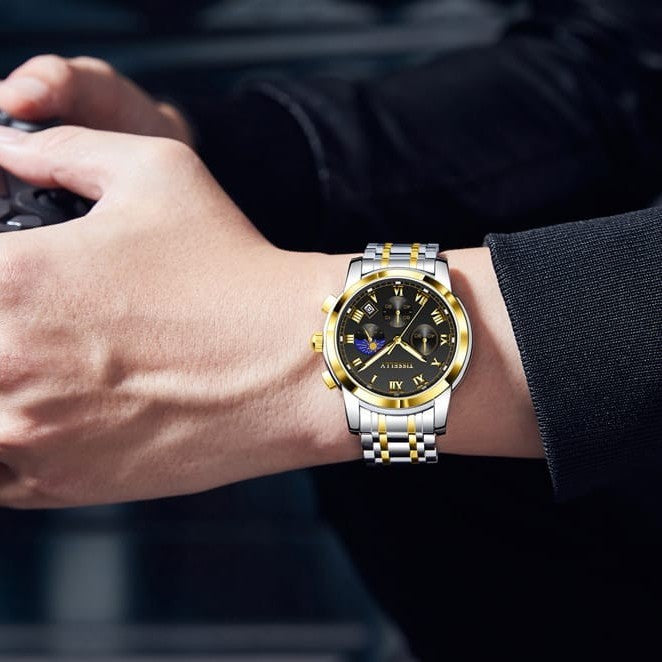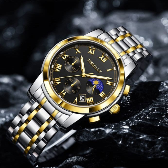 Tisselly 6619 Stainless Steel Strap Chronograph Watch for Men - Silver Gold & Black